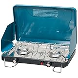 The Stansport Deluxe Two Burner Stove in Black features two 12,000 BTU's 3.25" burners, a high altitude pressure regulator and the Piezo igniter for matchless lighting. It also has a heavy duty pot or pan rack and a stainless steel drip pan. It's 18" length is compact for easy transport and portability. It uses a 16.4 oz disposable propane gas cylinder (NOT INCLUDED).